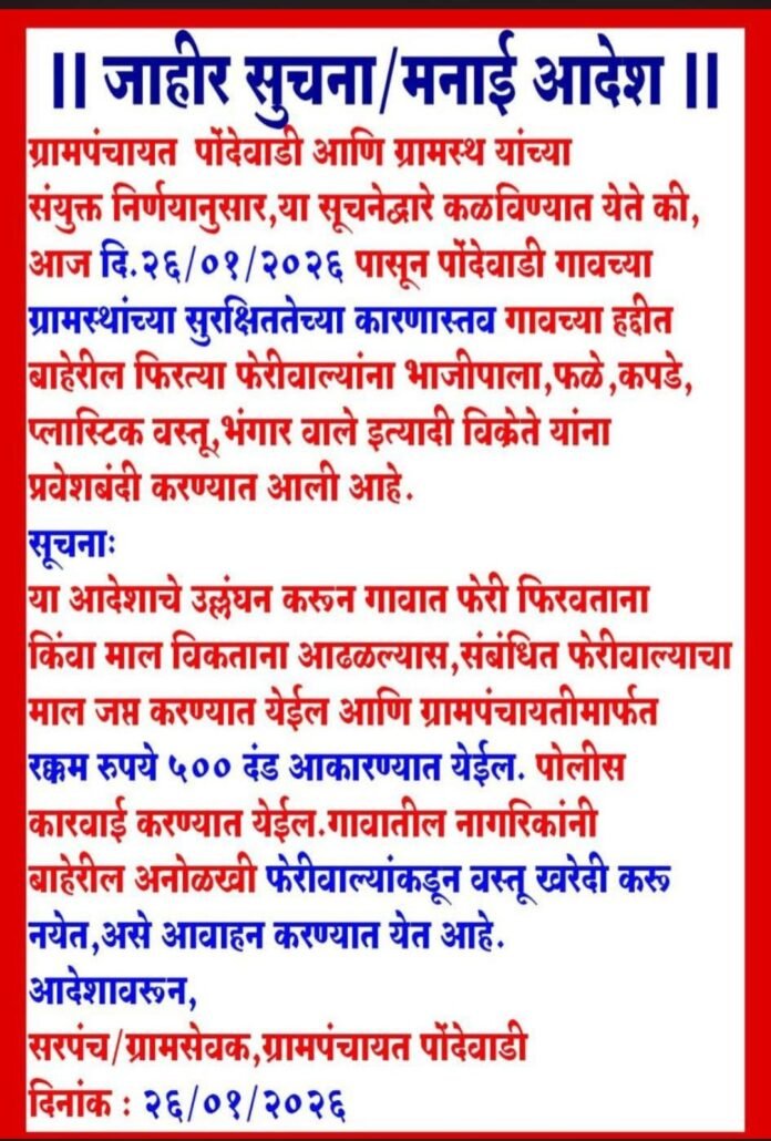 पोंदेवाडी (ता. आंबेगाव) येथील ग्रामपंचायत व ग्रामस्थांनी संयुक्तपणे महत्त्वाचा निर्णय घेतला आहे. गावातील नागरिकांच्या सुरक्षेच्या दृष्टीने दिनांक २६ जानेवारी २०२६ पासून गावाच्या हद्दीत बाहेरील फिरत्या फेरीवाल्यांना प्रवेश बंद करण्यात आला आहे.