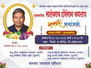 निंबवी (ता. श्रीगोंदा, जि. अहिल्यानगर) येथील ठाणे परिवहन विभागातील निवृत्त कर्मचारी साहेबराव हौसेराम जगताप यांचे शनिवार, दि. २८ मार्च २०२६ रोजी दुःखद निधन झाले.
